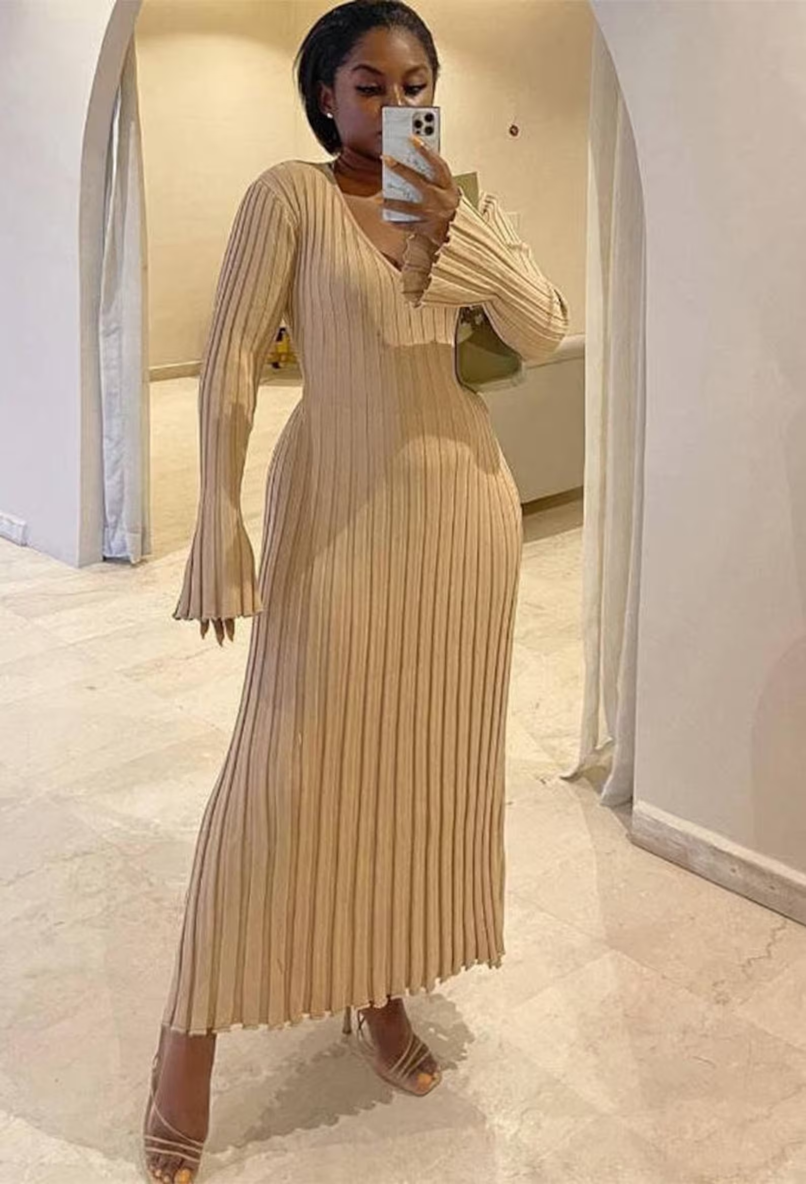 We designed the V Neck Sleeved Knit Midi Dress to embrace your body's natural curves while perfectly holding you in, ensuring you look and feel your best, just like all the women in our beautiful community. The perfect dress for any occasion.